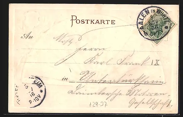 Personenbezogene Daten auf der Rückseite der Karte wurden durch blauen Textmarker unkenntlich gemacht. Die blauen Stellen sind auf die Vorderseite durchgeweicht und wirken sich negativ auf das Postkartenfoto aus