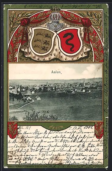 Passepartout-Lithographie Aalen, Totalansicht und Wappen