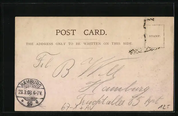 Personenbezogene Daten auf der Rückseite der Karte wurden durch blauen Textmarker unkenntlich gemacht. Die blauen Stellen sind auf die Vorderseite durchgeweicht und wirken sich negativ auf das Postkartenfoto aus