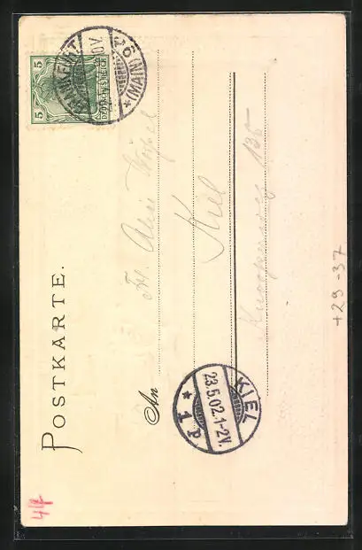 Personenbezogene Daten auf der Rückseite der Karte wurden durch blauen Textmarker unkenntlich gemacht. Die blauen Stellen sind auf die Vorderseite durchgeweicht und wirken sich negativ auf das Postkartenfoto aus
