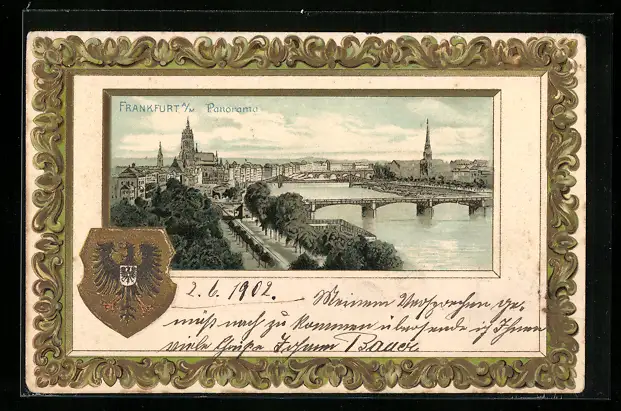 Passepartout-Lithographie Alt-Frankfurt, Panorama mit Eisernem Steg und Paulskirche