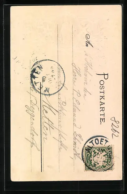 Personenbezogene Daten auf der Rückseite der Karte wurden durch blauen Textmarker unkenntlich gemacht. Die blauen Stellen sind auf die Vorderseite durchgeweicht und wirken sich negativ auf das Postkartenfoto aus
