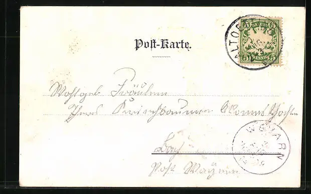 Personenbezogene Daten auf der Rückseite der Karte wurden durch blauen Textmarker unkenntlich gemacht. Die blauen Stellen sind auf die Vorderseite durchgeweicht und wirken sich negativ auf das Postkartenfoto aus