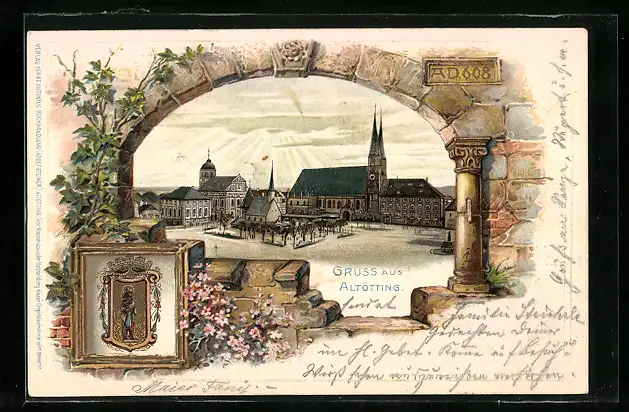 Passepartout-Lithographie Altötting, Ortspartie und Wappen