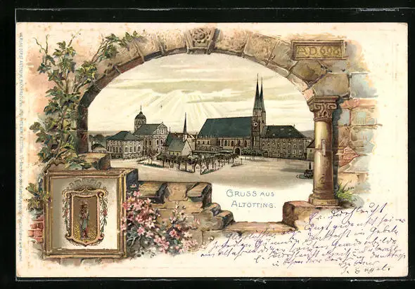 Passepartout-Lithographie Altötting, Partie am Marktplatz, Wappen