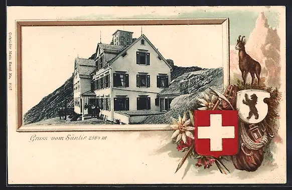 Passepartout-Lithographie Appenzell, Gasthaus auf dem Säntis, Wappen