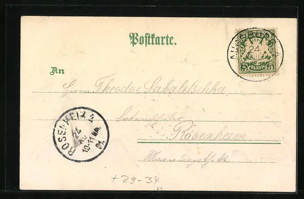 Personenbezogene Daten auf der Rückseite der Karte wurden durch blauen Textmarker unkenntlich gemacht. Die blauen Stellen sind auf die Vorderseite durchgeweicht und wirken sich negativ auf das Postkartenfoto aus