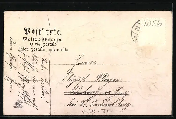 Personenbezogene Daten auf der Rückseite der Karte wurden durch blauen Textmarker unkenntlich gemacht. Die blauen Stellen sind auf die Vorderseite durchgeweicht und wirken sich negativ auf das Postkartenfoto aus