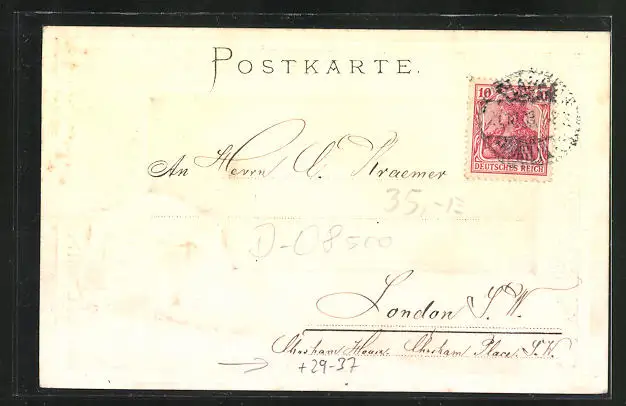 Personenbezogene Daten auf der Rückseite der Karte wurden durch blauen Textmarker unkenntlich gemacht. Die blauen Stellen sind auf die Vorderseite durchgeweicht und wirken sich negativ auf das Postkartenfoto aus