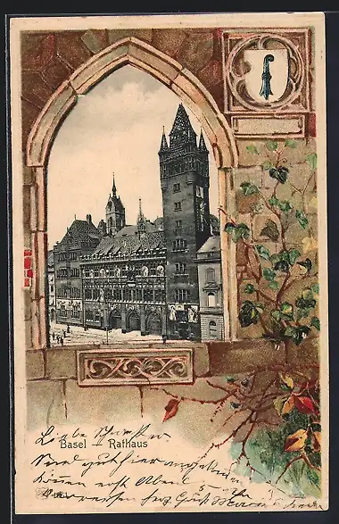 Passepartout-Lithographie Basel, Rathaus mit Wappen