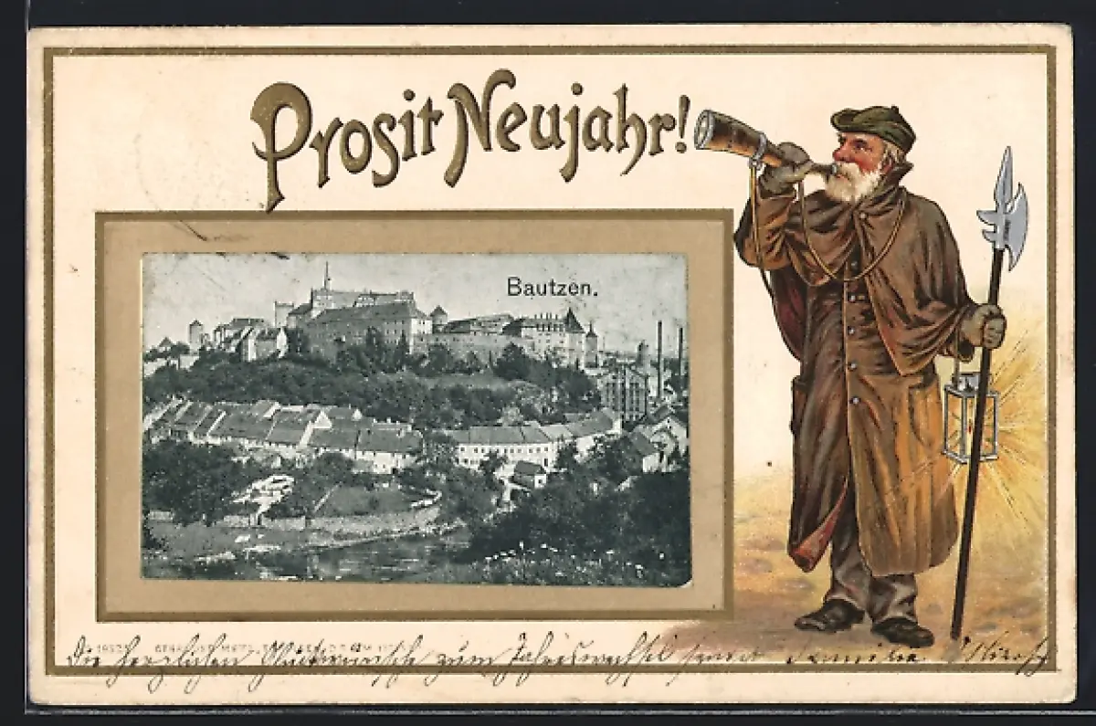 Passepartout-Lithographie Bautzen, Ortspanorama im Passepartout, Prosit Neujahr