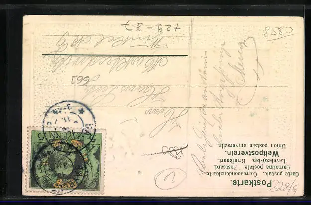 Personenbezogene Daten auf der Rückseite der Karte wurden durch blauen Textmarker unkenntlich gemacht. Die blauen Stellen sind auf die Vorderseite durchgeweicht und wirken sich negativ auf das Postkartenfoto aus