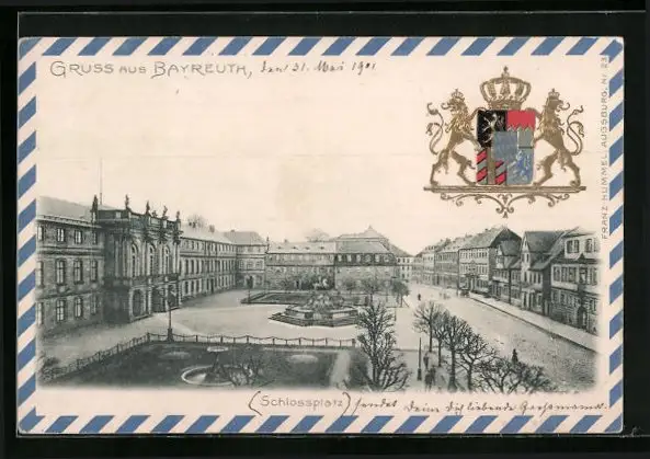 Passepartout-Lithographie Bayreuth, Schlossplatz mit Denkmal, Wappen