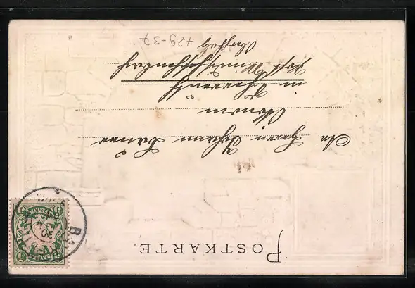 Personenbezogene Daten auf der Rückseite der Karte wurden durch blauen Textmarker unkenntlich gemacht. Die blauen Stellen sind auf die Vorderseite durchgeweicht und wirken sich negativ auf das Postkartenfoto aus