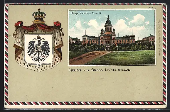 Passepartout-Lithographie Berlin-Gross-Lichterfelde, Haupt Kadetten-Anstalt, Wappen