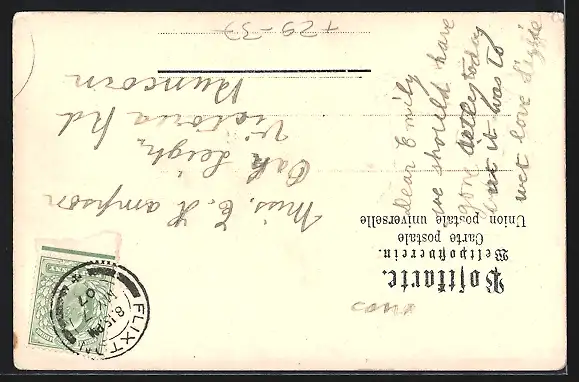 Personenbezogene Daten auf der Rückseite der Karte wurden durch blauen Textmarker unkenntlich gemacht. Die blauen Stellen sind auf die Vorderseite durchgeweicht und wirken sich negativ auf das Postkartenfoto aus