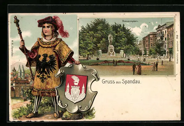 Passepartout-Lithographie Berlin-Spandau, Bismarckplatz mit Wappen, Kleiner Herold