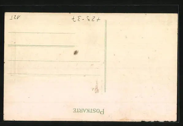 Personenbezogene Daten auf der Rückseite der Karte wurden durch blauen Textmarker unkenntlich gemacht. Die blauen Stellen sind auf die Vorderseite durchgeweicht und wirken sich negativ auf das Postkartenfoto aus