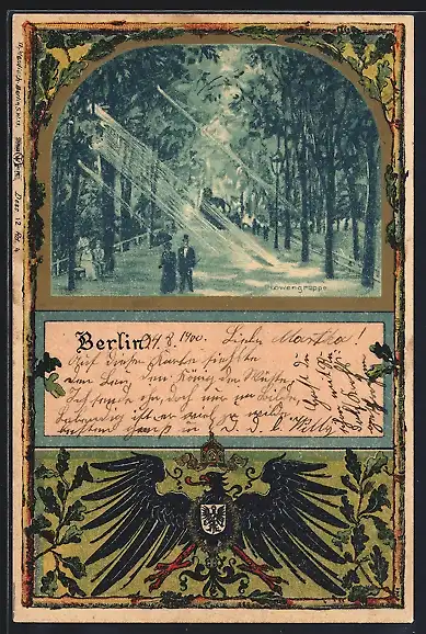 Passepartout-Lithographie Berlin-Tiergarten, Löwengruppe im Park, Reichsadler