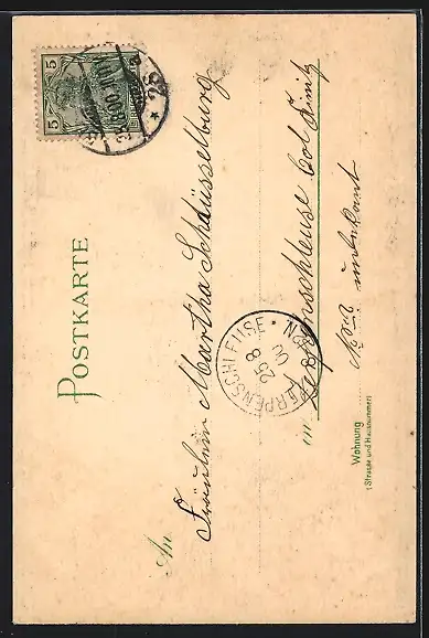 Personenbezogene Daten auf der Rückseite der Karte wurden durch blauen Textmarker unkenntlich gemacht. Die blauen Stellen sind auf die Vorderseite durchgeweicht und wirken sich negativ auf das Postkartenfoto aus