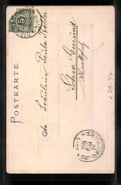 Personenbezogene Daten auf der Rückseite der Karte wurden durch blauen Textmarker unkenntlich gemacht. Die blauen Stellen sind auf die Vorderseite durchgeweicht und wirken sich negativ auf das Postkartenfoto aus