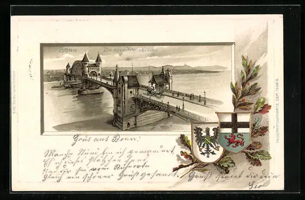 Passepartout-Lithographie Bonn, Neue Rheinbrücke und Wappen