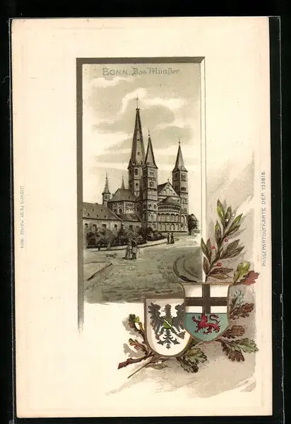 Passepartout-Lithographie Bonn, Strassenpartie mit Münster, Wappen