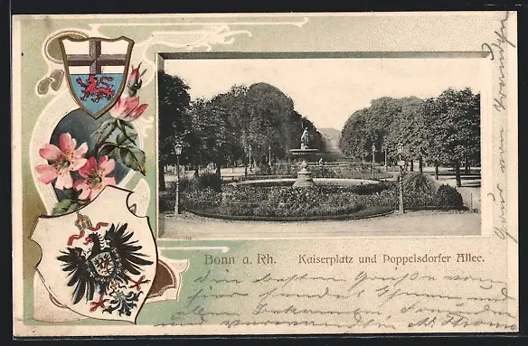 Passepartout-Lithographie Bonn a. Rh., Kaiserplatz und Poppelsdorfer Allee, Wappen