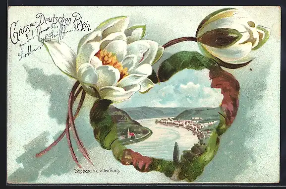 Passepartout-Lithographie Boppard, Ortsansicht auf einem Seerosenblatt