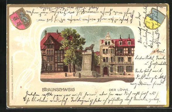 Passepartout-Lithographie Braunschweig, Statue Der Löwe, Wappen