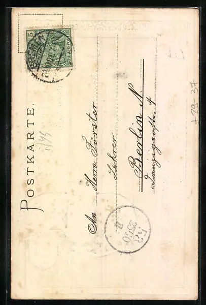 Personenbezogene Daten auf der Rückseite der Karte wurden durch blauen Textmarker unkenntlich gemacht. Die blauen Stellen sind auf die Vorderseite durchgeweicht und wirken sich negativ auf das Postkartenfoto aus