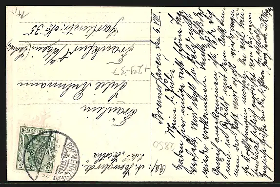 Personenbezogene Daten auf der Rückseite der Karte wurden durch blauen Textmarker unkenntlich gemacht. Die blauen Stellen sind auf die Vorderseite durchgeweicht und wirken sich negativ auf das Postkartenfoto aus