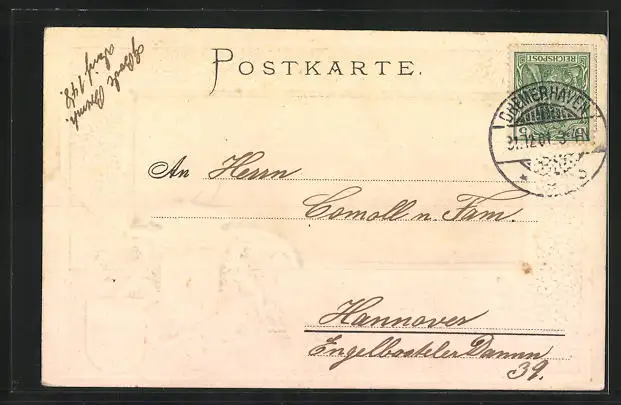 Personenbezogene Daten auf der Rückseite der Karte wurden durch blauen Textmarker unkenntlich gemacht. Die blauen Stellen sind auf die Vorderseite durchgeweicht und wirken sich negativ auf das Postkartenfoto aus