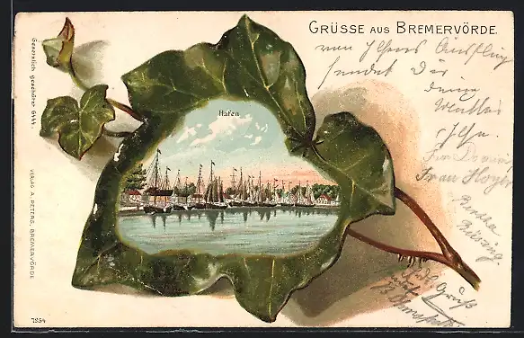 Passepartout-Lithographie Bremervörde, Hafen in Efeublatt
