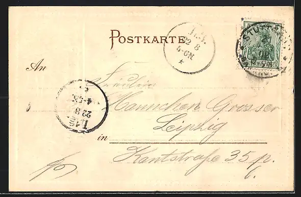 Personenbezogene Daten auf der Rückseite der Karte wurden durch blauen Textmarker unkenntlich gemacht. Die blauen Stellen sind auf die Vorderseite durchgeweicht und wirken sich negativ auf das Postkartenfoto aus