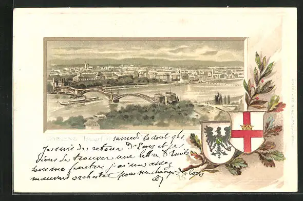 Passepartout-Lithographie Coblenz, Totalansicht mit Brücke, Wappen