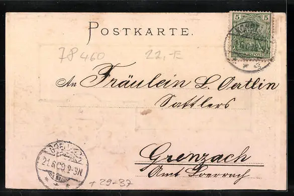 Personenbezogene Daten auf der Rückseite der Karte wurden durch blauen Textmarker unkenntlich gemacht. Die blauen Stellen sind auf die Vorderseite durchgeweicht und wirken sich negativ auf das Postkartenfoto aus