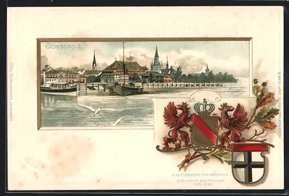 Passepartout-Lithographie Constanz, Teilansicht mit Hafen, Wappen