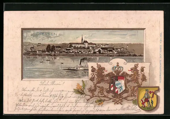 Passepartout-Lithographie Diessen, Teilansicht mit Dampfer, Wappen