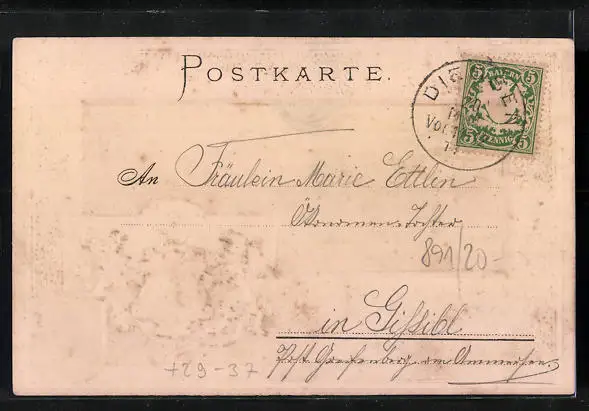 Personenbezogene Daten auf der Rückseite der Karte wurden durch blauen Textmarker unkenntlich gemacht. Die blauen Stellen sind auf die Vorderseite durchgeweicht und wirken sich negativ auf das Postkartenfoto aus
