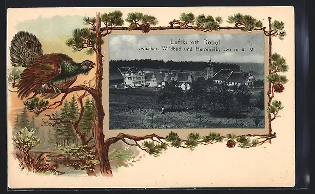 Passepartout-Lithographie Dobel / Schwarzwald, Ortsansicht mit Kirche, Auerhahn
