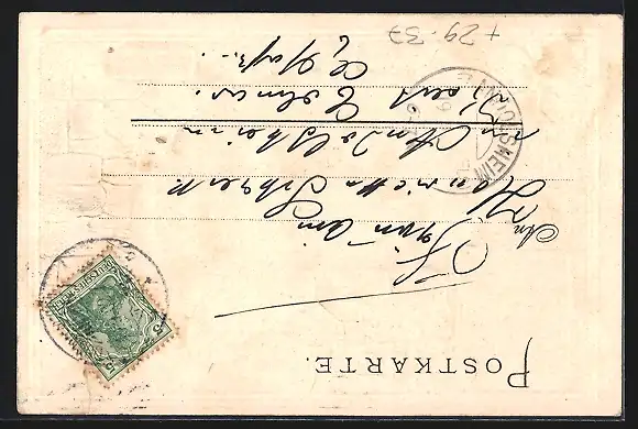 Personenbezogene Daten auf der Rückseite der Karte wurden durch blauen Textmarker unkenntlich gemacht. Die blauen Stellen sind auf die Vorderseite durchgeweicht und wirken sich negativ auf das Postkartenfoto aus