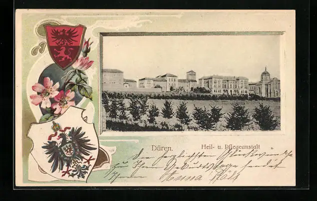 Passepartout-Lithographie Düren, Heil- und Pflegeanstalt mit Wappen