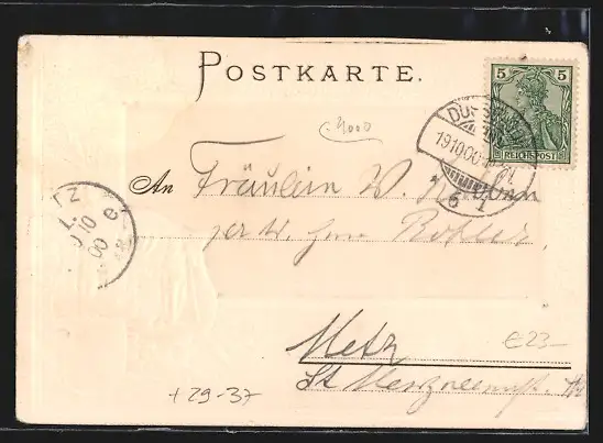 Personenbezogene Daten auf der Rückseite der Karte wurden durch blauen Textmarker unkenntlich gemacht. Die blauen Stellen sind auf die Vorderseite durchgeweicht und wirken sich negativ auf das Postkartenfoto aus