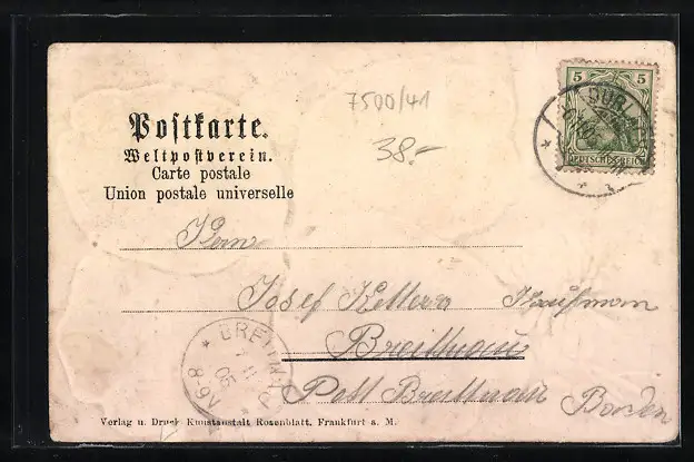 gelaufen 1905, rückseitig Oberflächenschaden, Bugspuren li. oben, guter Zustand