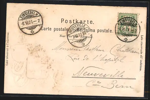 Personenbezogene Daten auf der Rückseite der Karte wurden durch blauen Textmarker unkenntlich gemacht. Die blauen Stellen sind auf die Vorderseite durchgeweicht und wirken sich negativ auf das Postkartenfoto aus