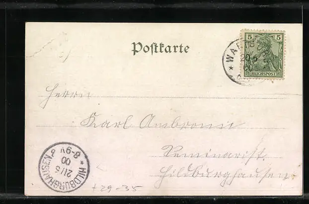 Personenbezogene Daten auf der Rückseite der Karte wurden durch blauen Textmarker unkenntlich gemacht. Die blauen Stellen sind auf die Vorderseite durchgeweicht und wirken sich negativ auf das Postkartenfoto aus