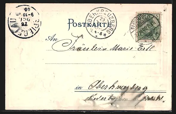 Personenbezogene Daten auf der Rückseite der Karte wurden durch blauen Textmarker unkenntlich gemacht. Die blauen Stellen sind auf die Vorderseite durchgeweicht und wirken sich negativ auf das Postkartenfoto aus