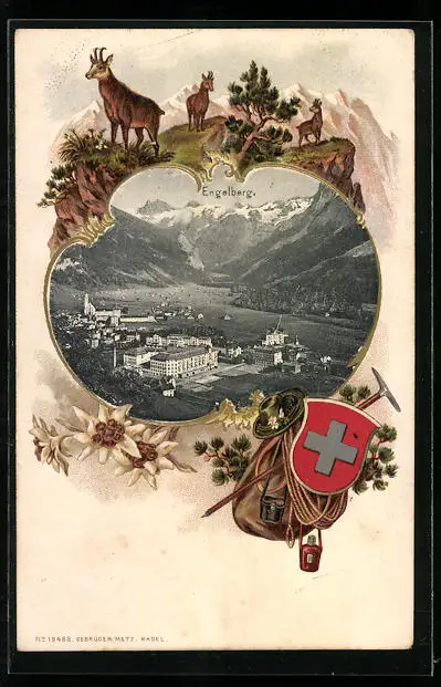 Passepartout-Lithographie Engelberg, Ortsansicht aus der Vogelschau, Wappen