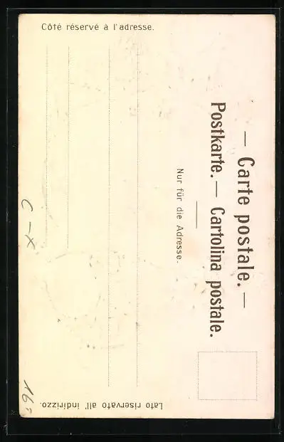 Personenbezogene Daten auf der Rückseite der Karte wurden durch blauen Textmarker unkenntlich gemacht. Die blauen Stellen sind auf die Vorderseite durchgeweicht und wirken sich negativ auf das Postkartenfoto aus